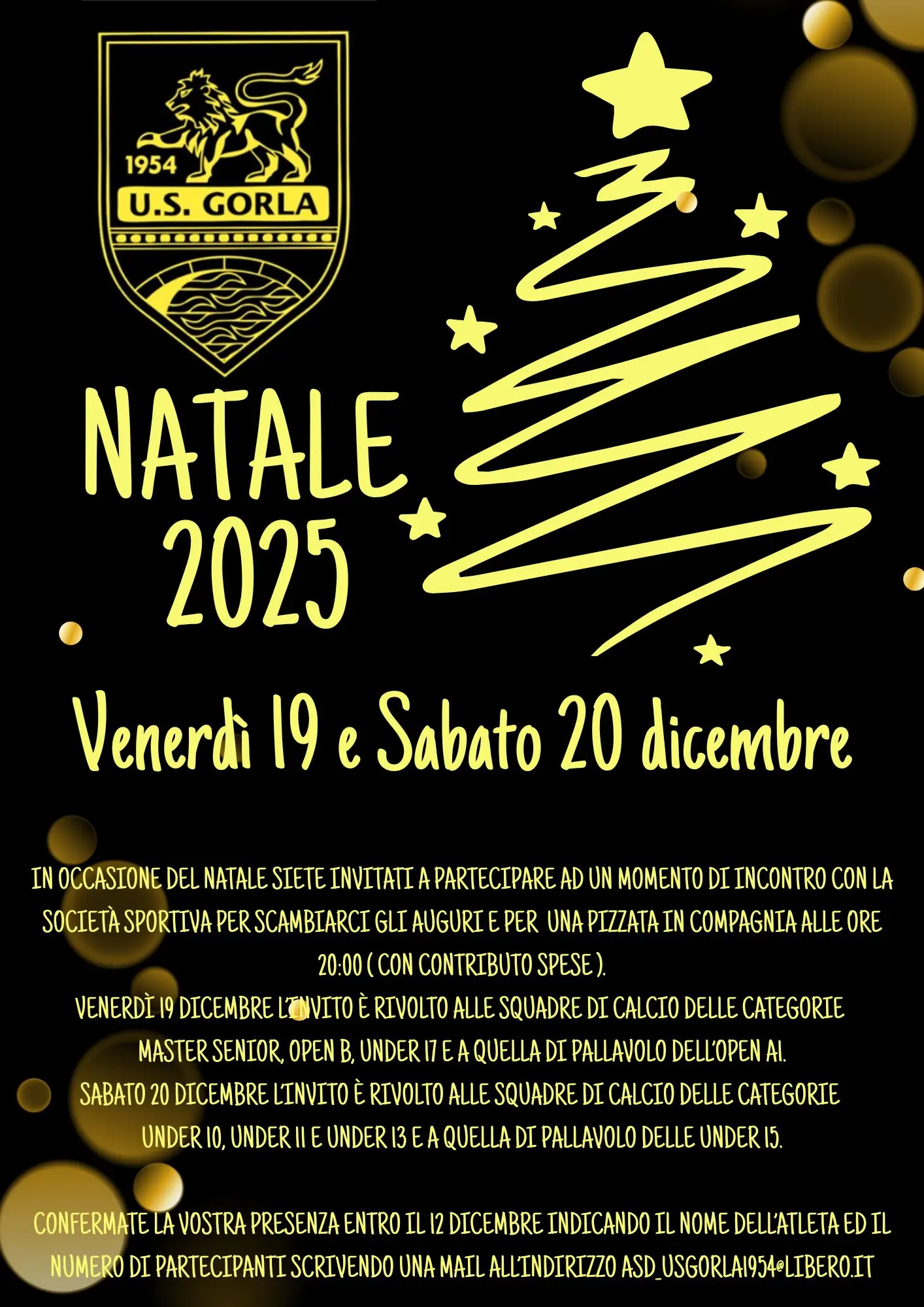 Confermate la vostra presenza entro il 12 dicembre scrivendo una mail all’indirizzo: asd_usgorla1954@libero.it indicando il nome dell’atleta ed il numero di partecipanti.